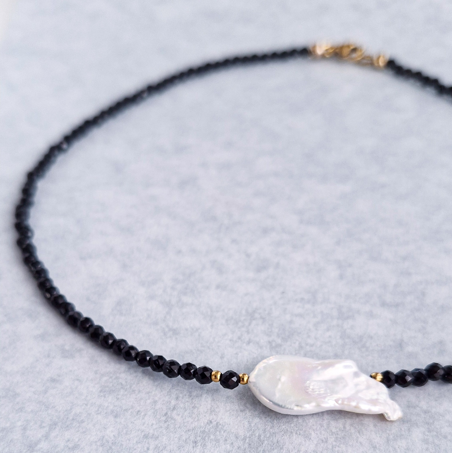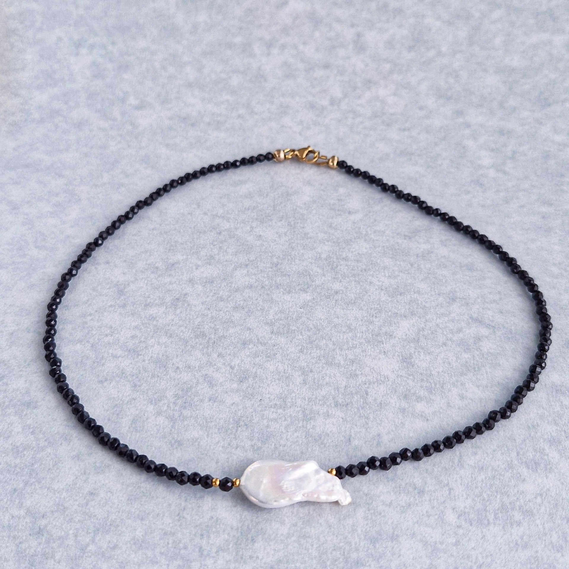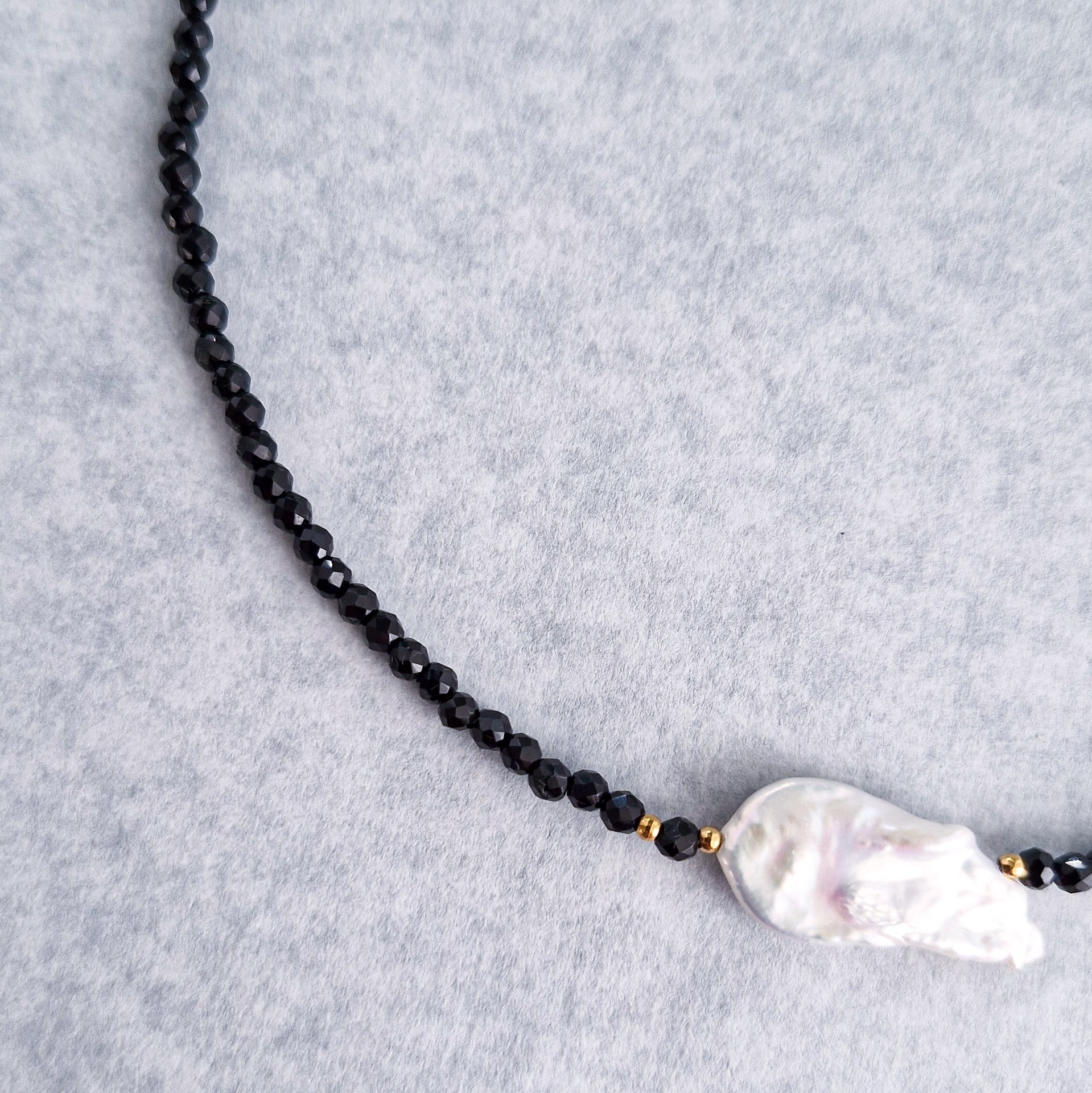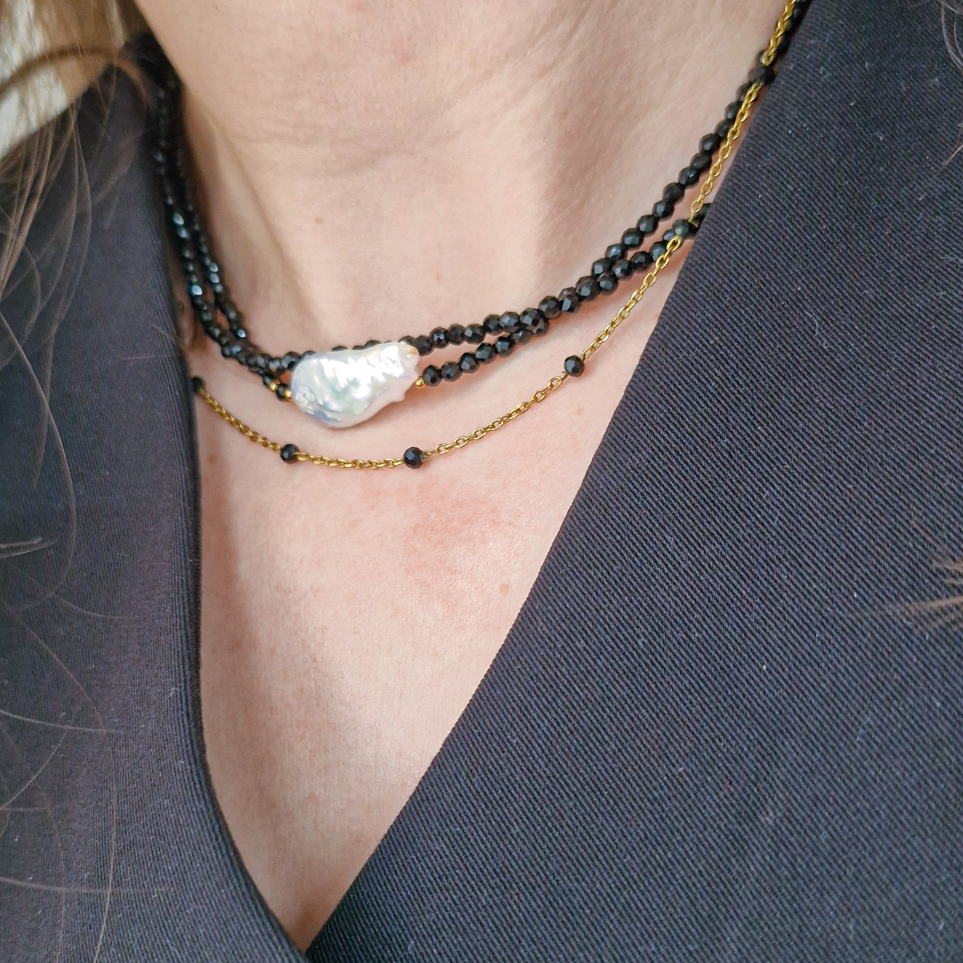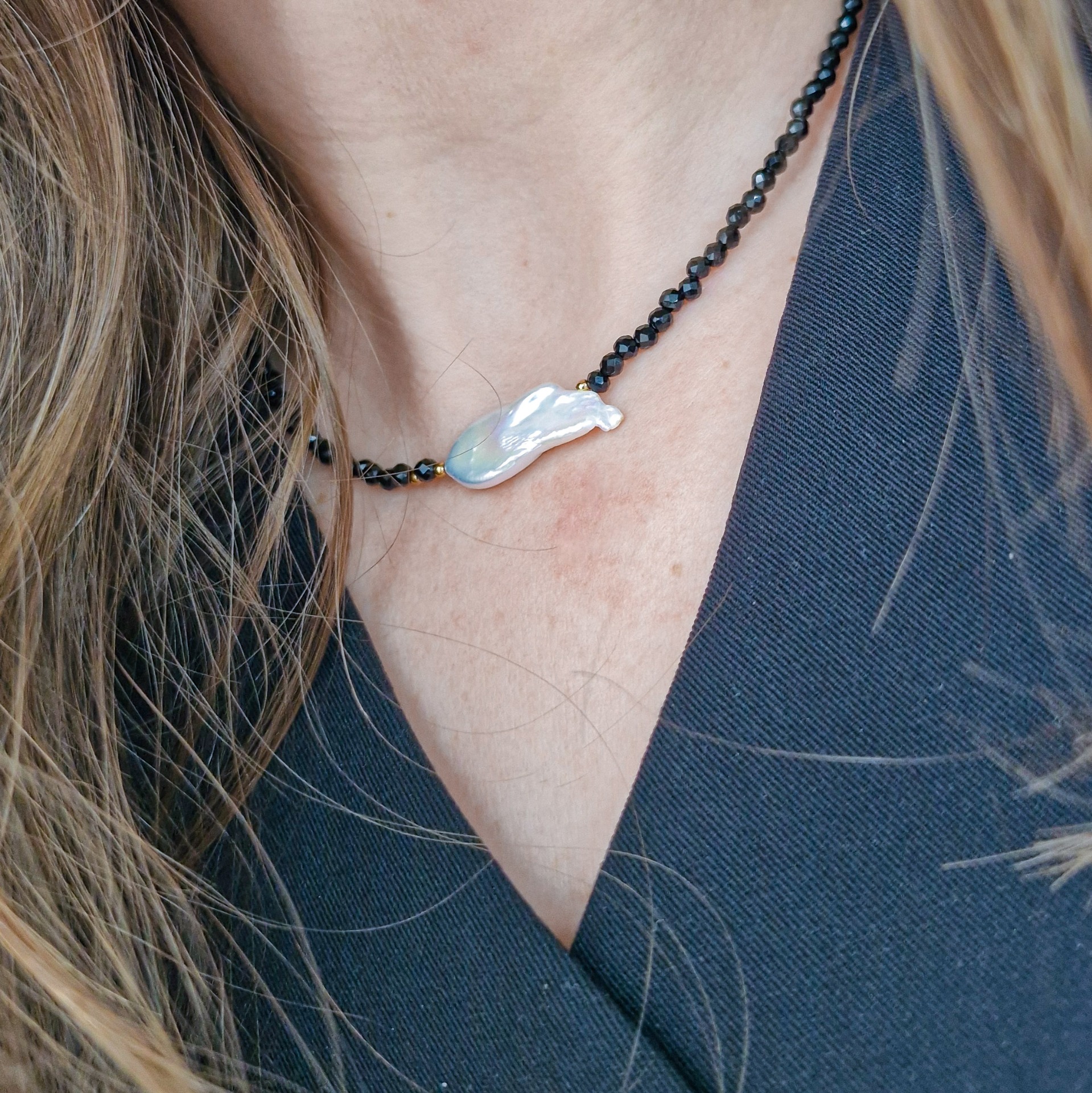 Tento náhrdelník je oslavou kontrastov. Jemné brúsené čierne korálky vytvárajú elegantný základ, ktorý dopĺňa unikátna riečna baroková perla – každá má svoj vlastný tvar, a preto je každý kus originál.