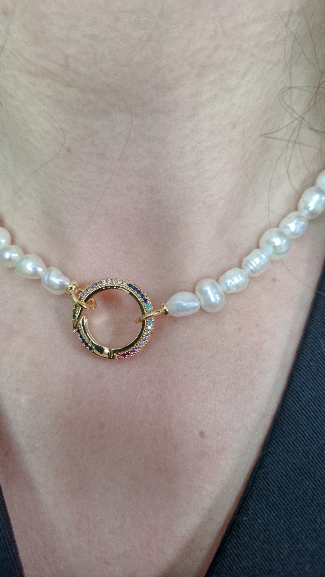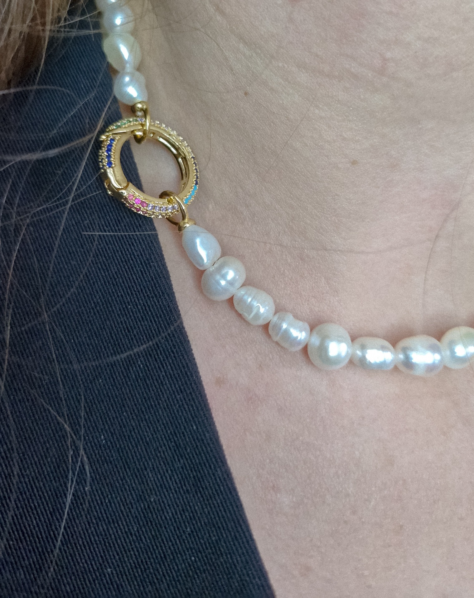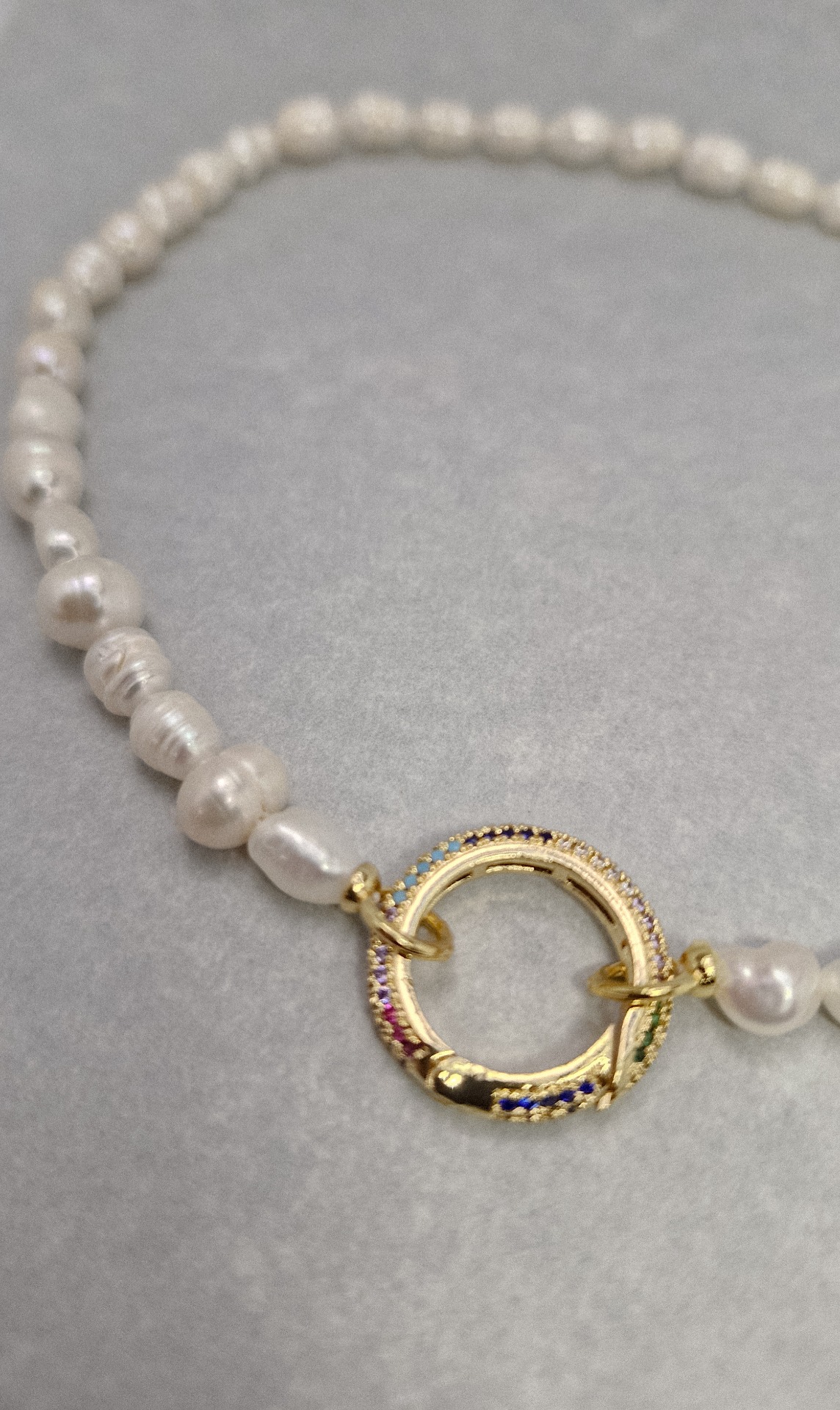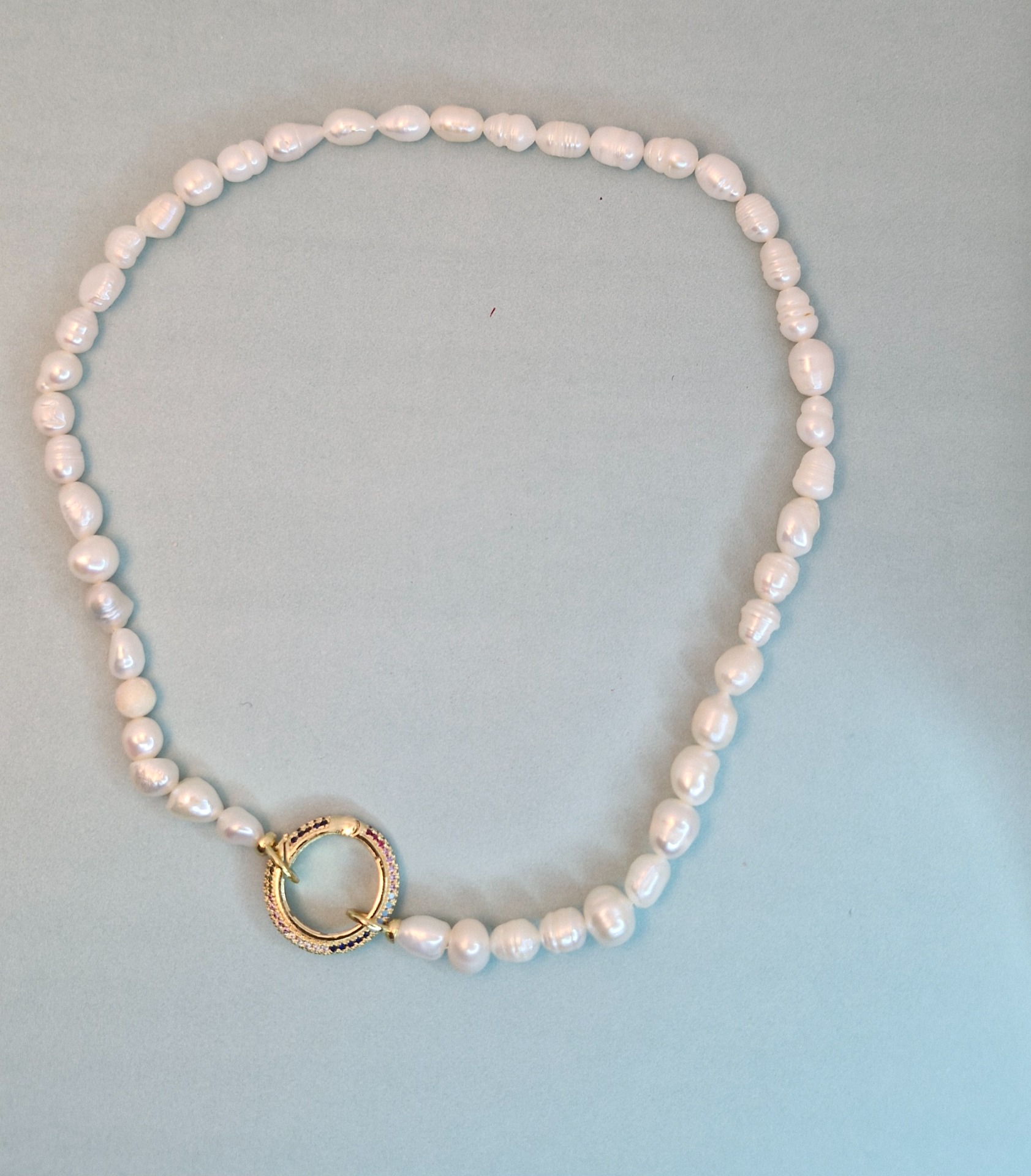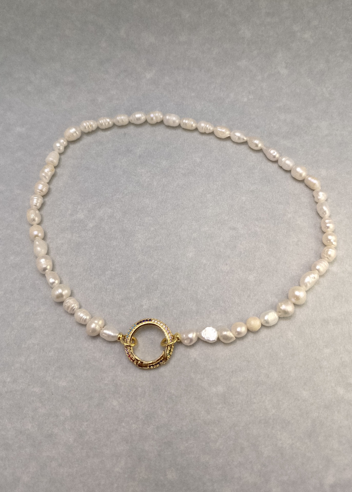 Náhrdelník z pravej riečnej perly s ozdobným zapínaním s farebnými kamienkami. Dĺžka náhrdelníka je 37cm.