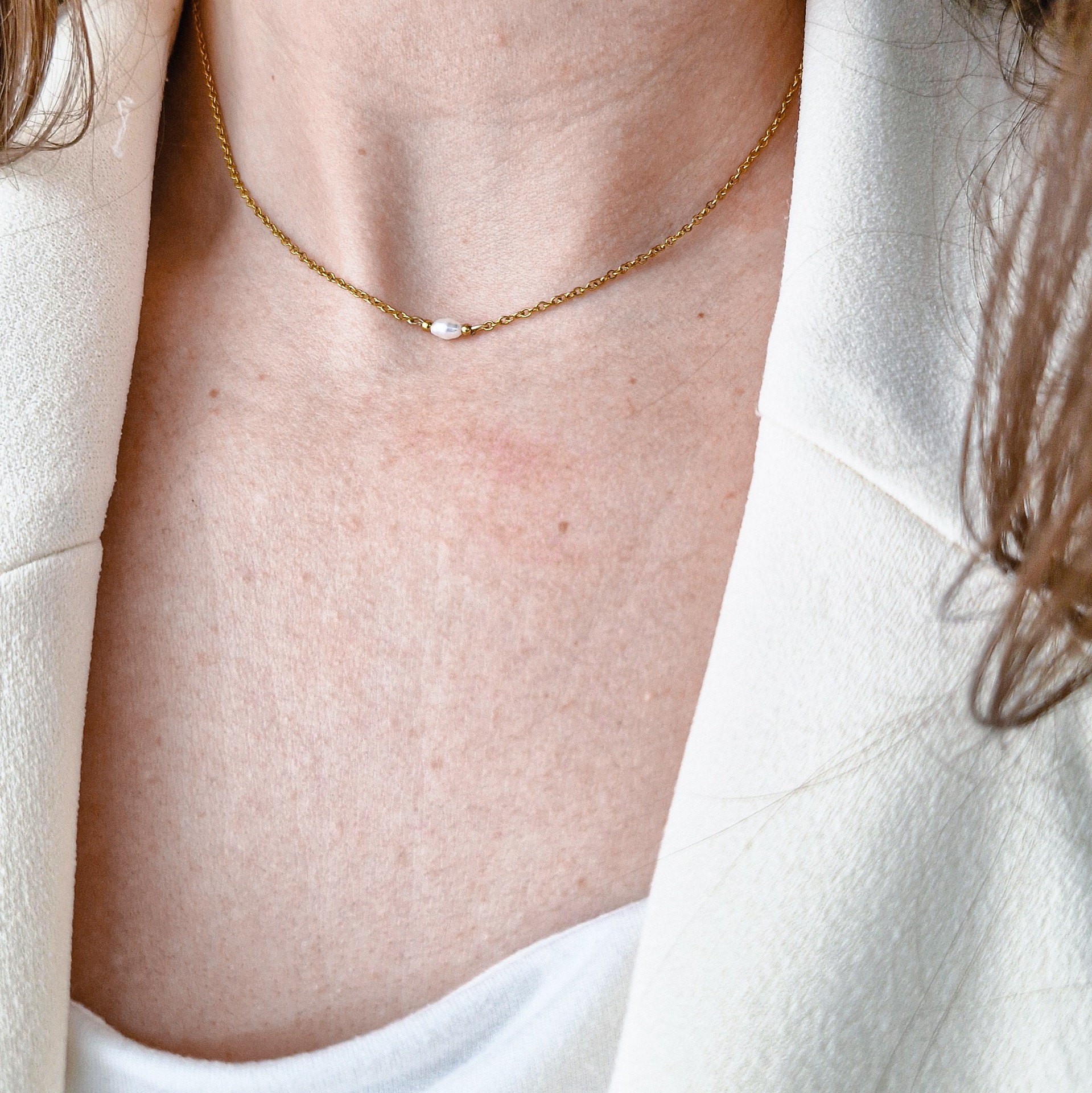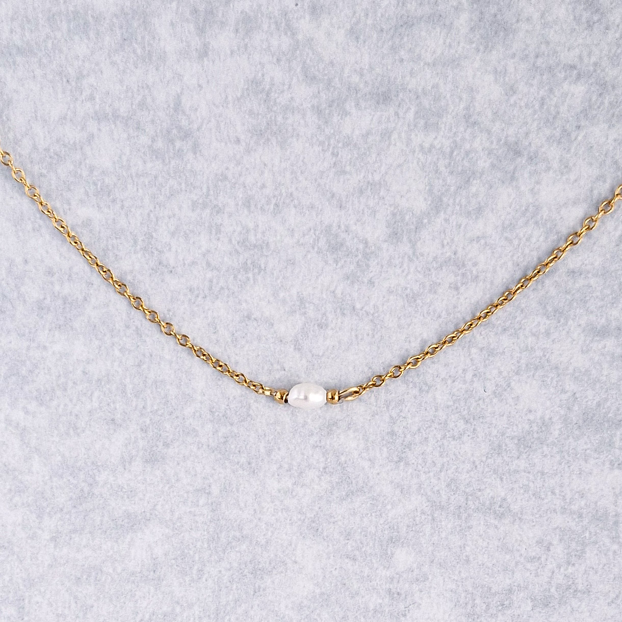 Jemná zlatá retiazka doplnená o jednu prírodnú riečnu perlu vytvára nadčasový šperk, ktorý zvýrazní tvoju prirodzenú krásu bez zbytočných detailov.