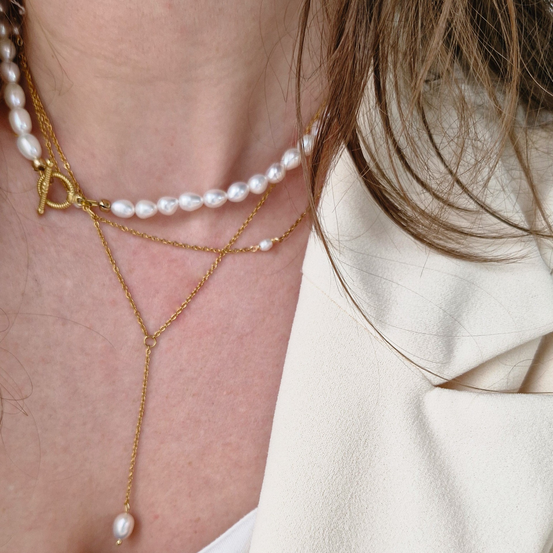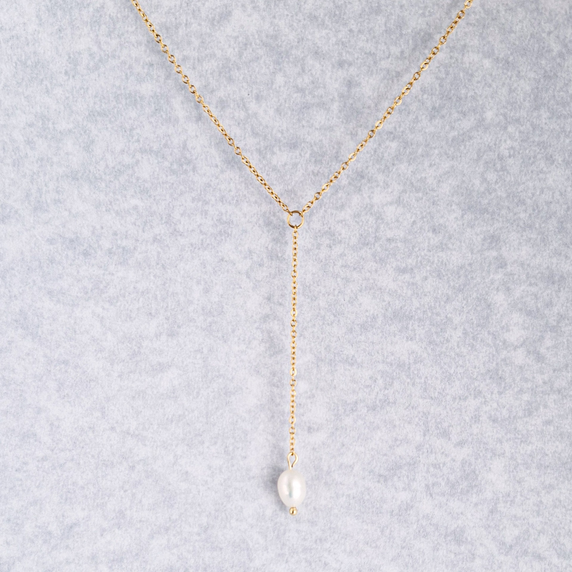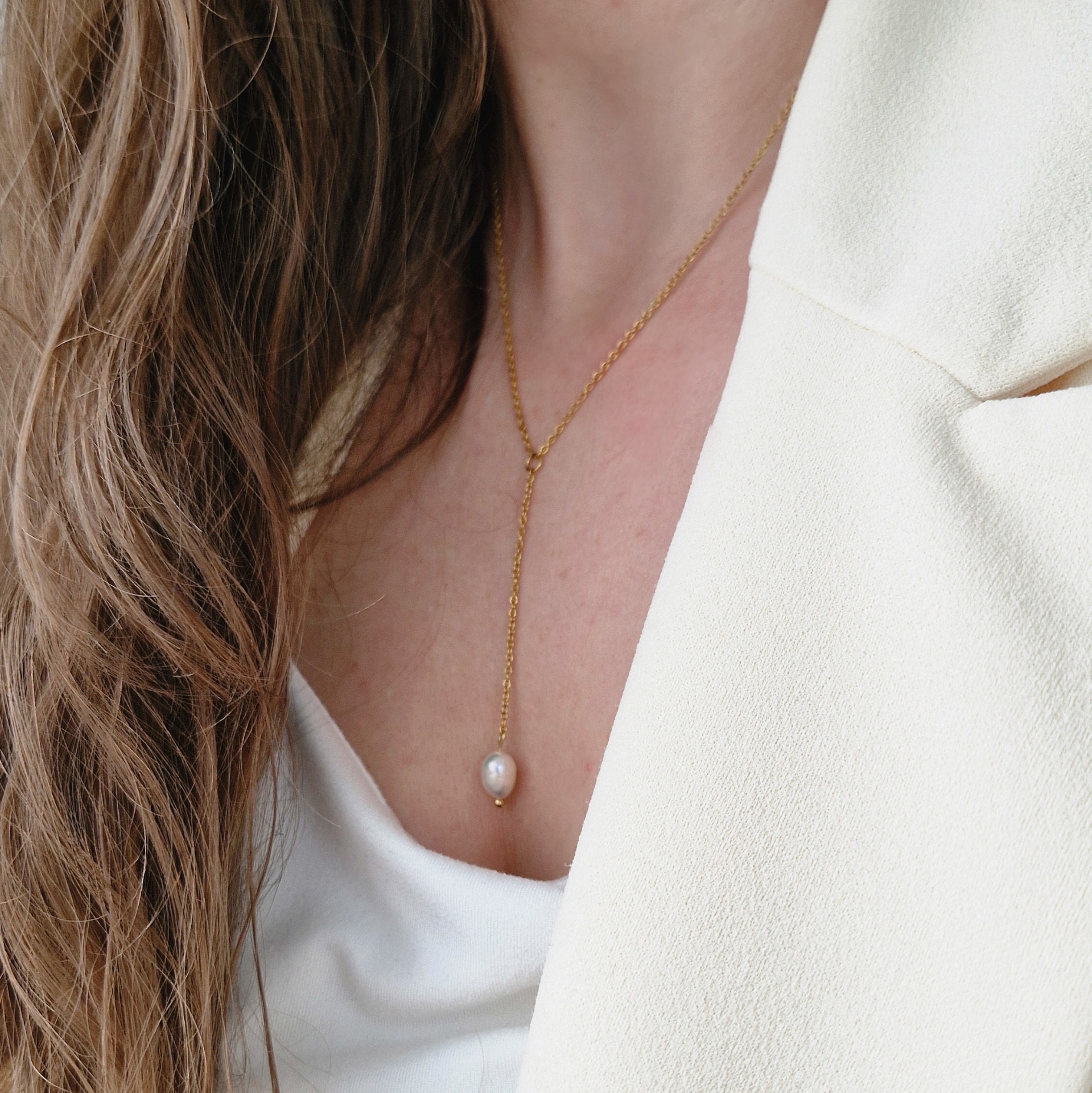 Tento náhrdelník v Y tvare je doplnený o prírodnú riečnu perlu, ktorá voľne visí a vytvára sofistikovaný, ženský detail. Minimalistický dizajn zvýrazňuje dekolt a dodáva outfitu nenápadný, no výrazný akcent.
