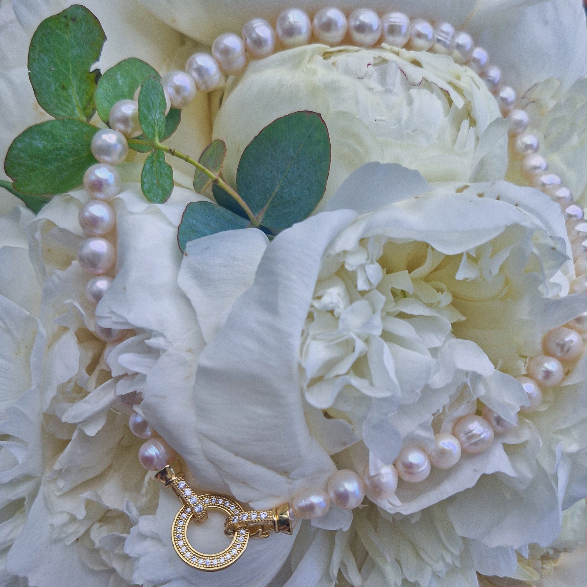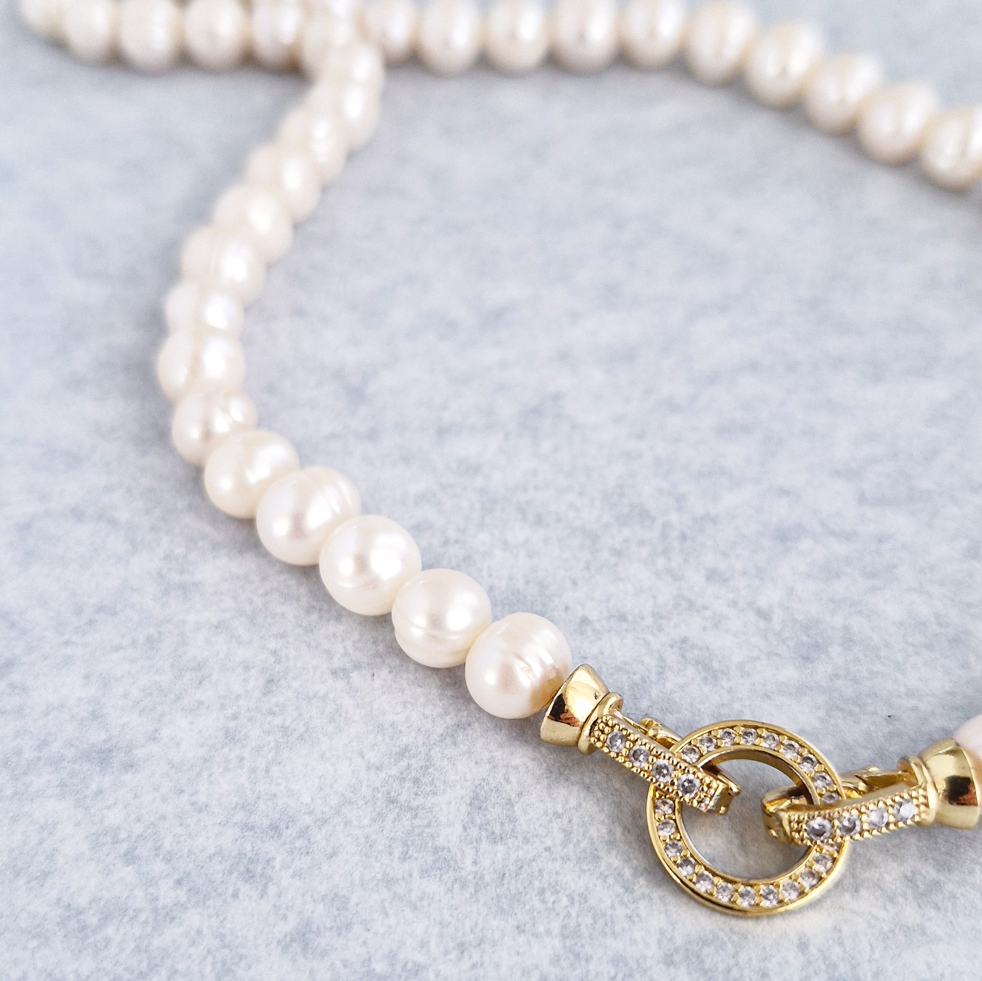 Elegantný perlový náhrdelník, ktorý spája jemnosť prírodných perál s výrazným detailom zapínania.