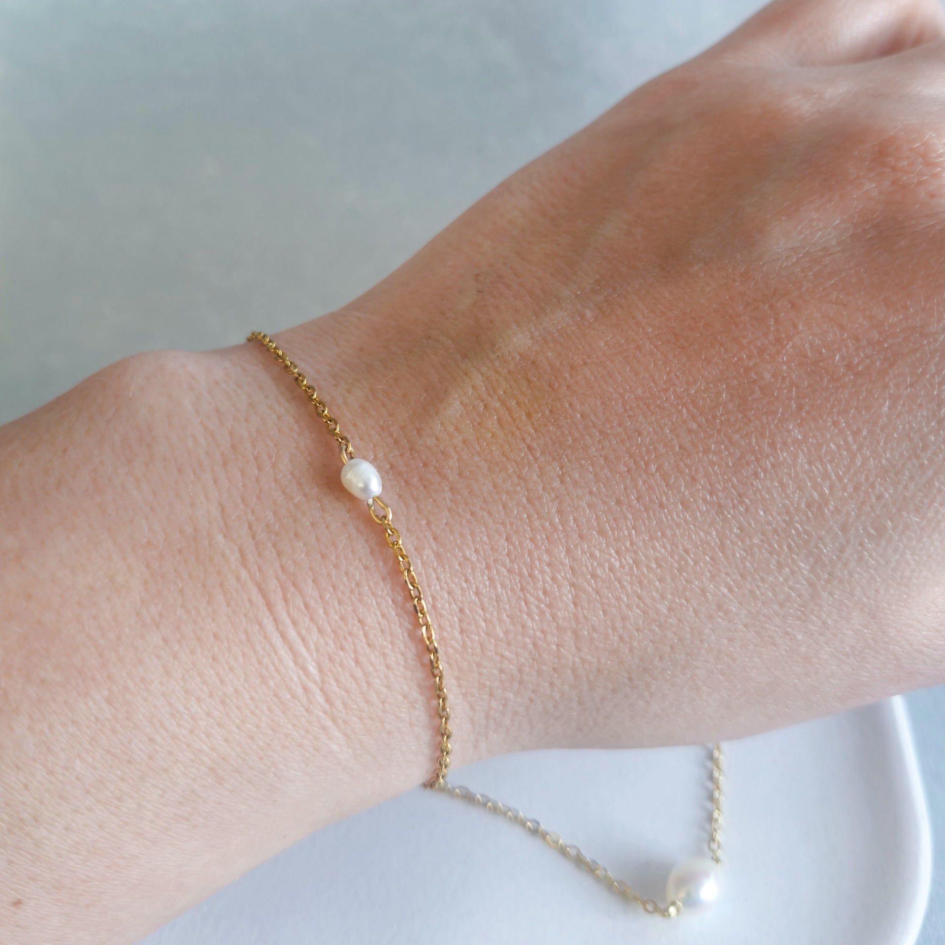 Jemný náramok s jednou pravou riečnou perlou, ktorý stelesňuje čistotu a jednoduchosť. Decentná retiazka v kombinácii s prirodzeným leskom perly vytvára elegantný doplnok vhodný na každodenné nosenie.