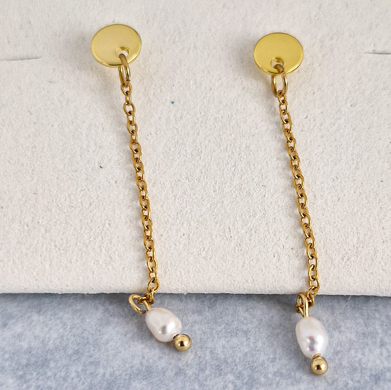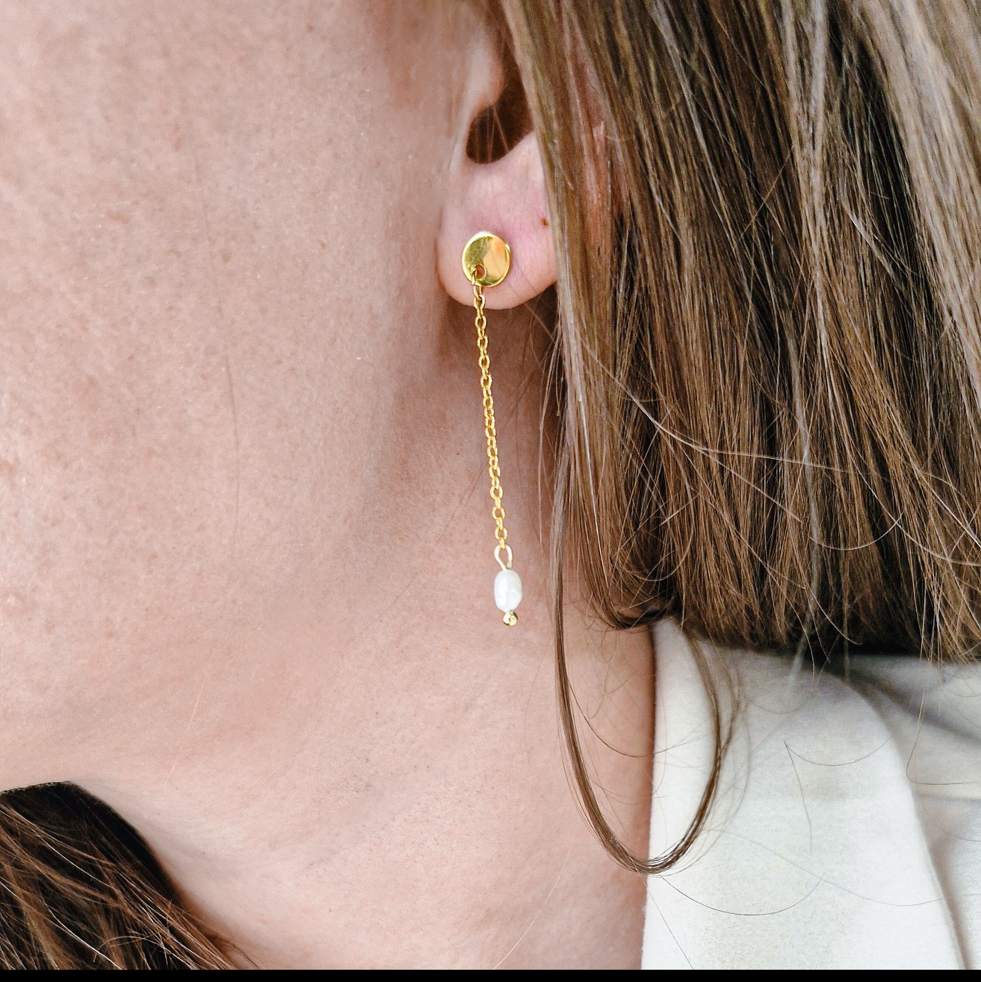 Minimalistický dizajn spája zlatý detail s pohyblivou retiazkou a pravou riečnou perlou, ktorá sa pri každom pohybe jemne zachytí svetla.
