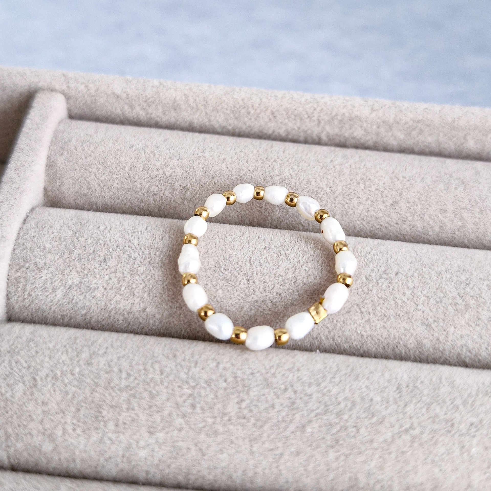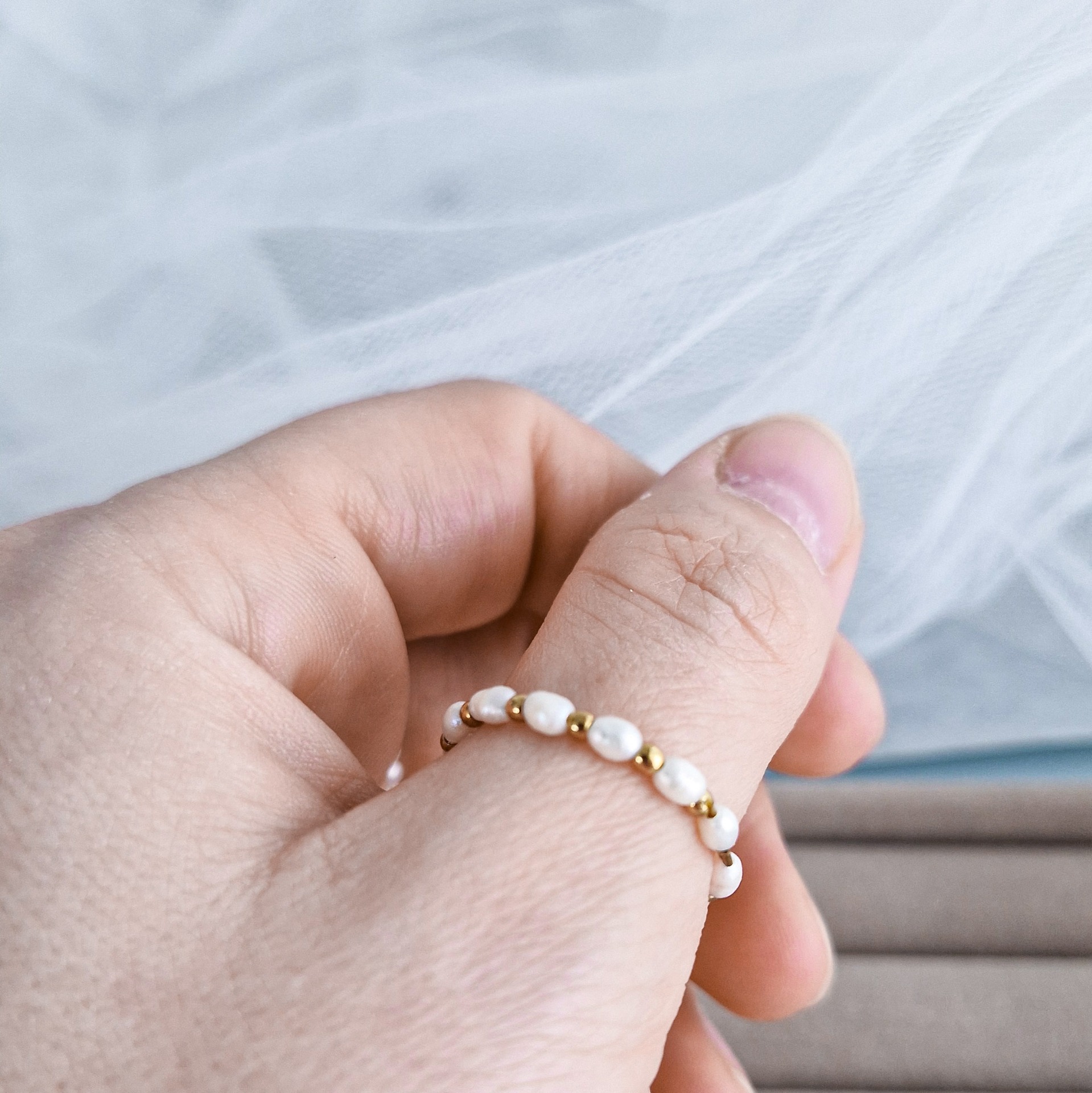 Jemný prsteň z pravých riečnych perál doplnený o drobné zlaté detaily, ktorý pôsobí elegantne a prirodzene zároveň. Minimalistický dizajn zvýrazňuje krásu každej perly a vytvára harmonický, nadčasový šperk.
